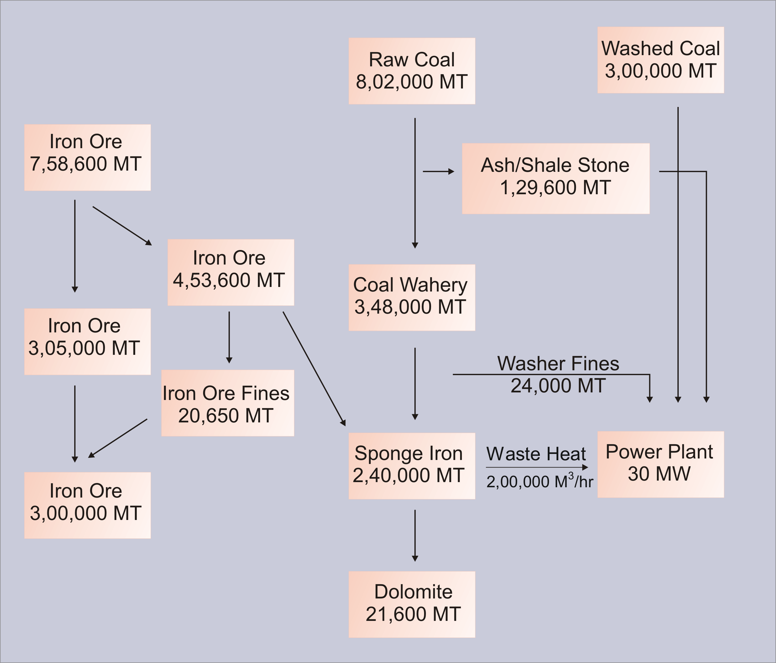 Iron & 3,00,000 Tons of pallets & 30 MW power